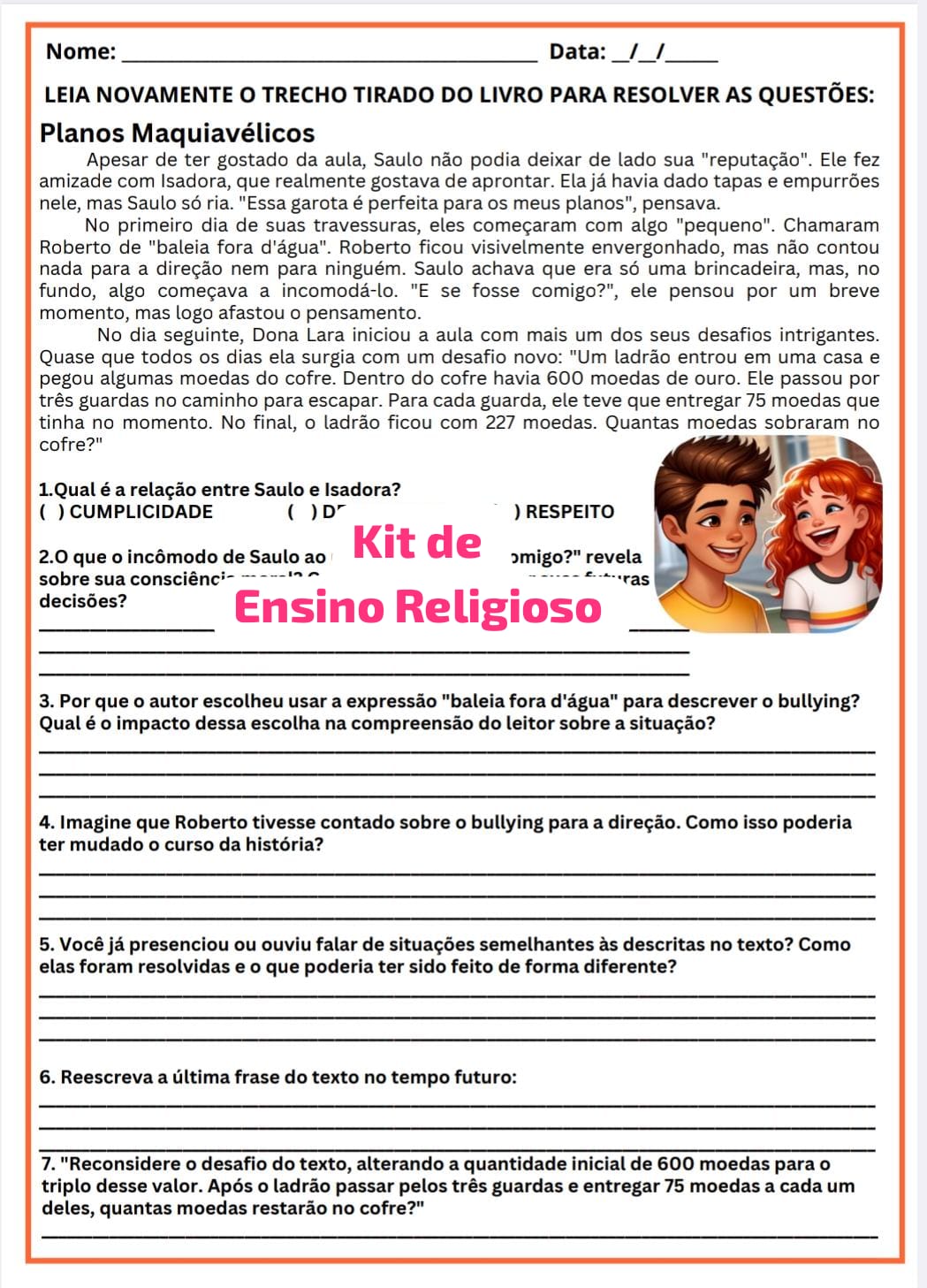 Kit de Ensino Religioso:Sequência Didática sobre Emoções, Gratidão, Bullying e Respeito às crenças – 4º e 5º Ano